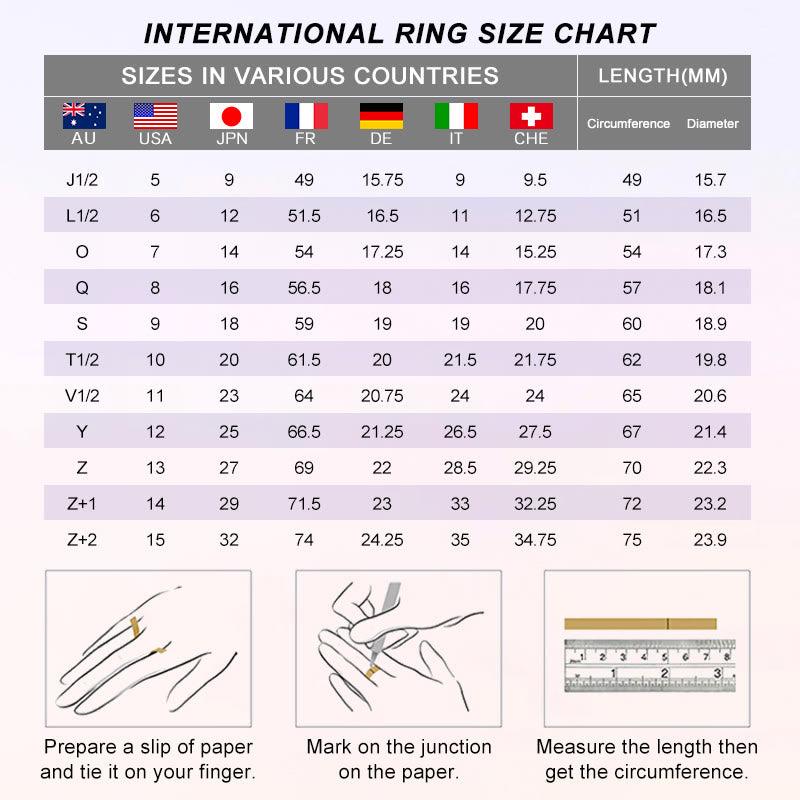 If you don't know your size, you can use a piece of paper, tie it around your finger and then measure it using a ruler in millimeters. After that just match it with the chart below.
