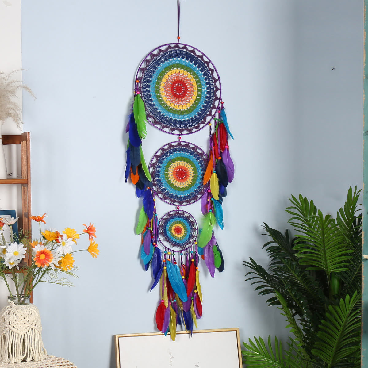 Multiple Patterns Bohemian Woven dream catcher is a handcrafted piece that weaves together intricate patterns, bringing vibrant energy and positive vibes into any room. With each design reflecting unique bohemian symbols, this dream catcher promotes harmony and peaceful sleep. The colorful feathers gracefully hang below, representing protection and spiritual clarity, making it ideal for meditation and mindful spaces.