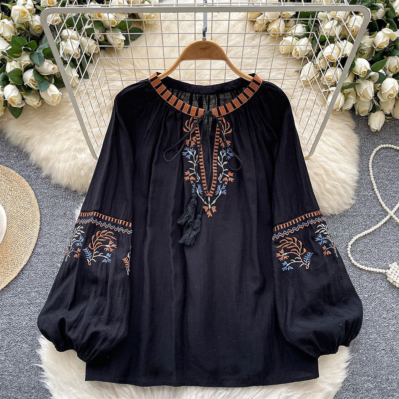 Step into timeless charm with the Literary Fresh Retro Embroidery Women's Shirt. Made from a breathable cotton-linen blend, this one-size top features delicate floral embroidery that whispers vintage elegance. The round-to-V neckline with a drawstring detail and flowing lantern sleeves add softness and a touch of poetic flair. 🌸📖